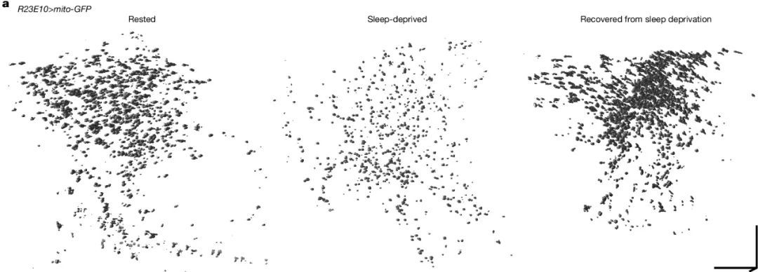 除了导致全脑氧化除外,熬大夜或寝息强抢还有一个严重的成果,那等于让线粒体裂开,数目也急剧下跌。米森伯克团队发现,在被寝息强抢 12 小时的果蝇中,dFB 神经元内的线粒体会发生较着更正。本年 7 月,他们将这一发现发表在了《天然》上。