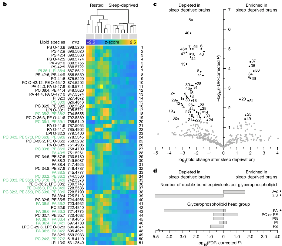 图片直不雅展示了休息和寝息强抢的情况下,果蝇大脑中的甘油磷脂的变化,从左图中休息景况和寝息强抢的对比不错看出,相当多种甘油磷脂的数目减少了,独一少数几种增多了。右边的两个图也裸露了这种变化,图片起原于本年3月发表于《天然》的论文