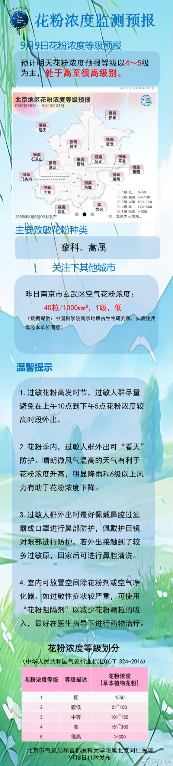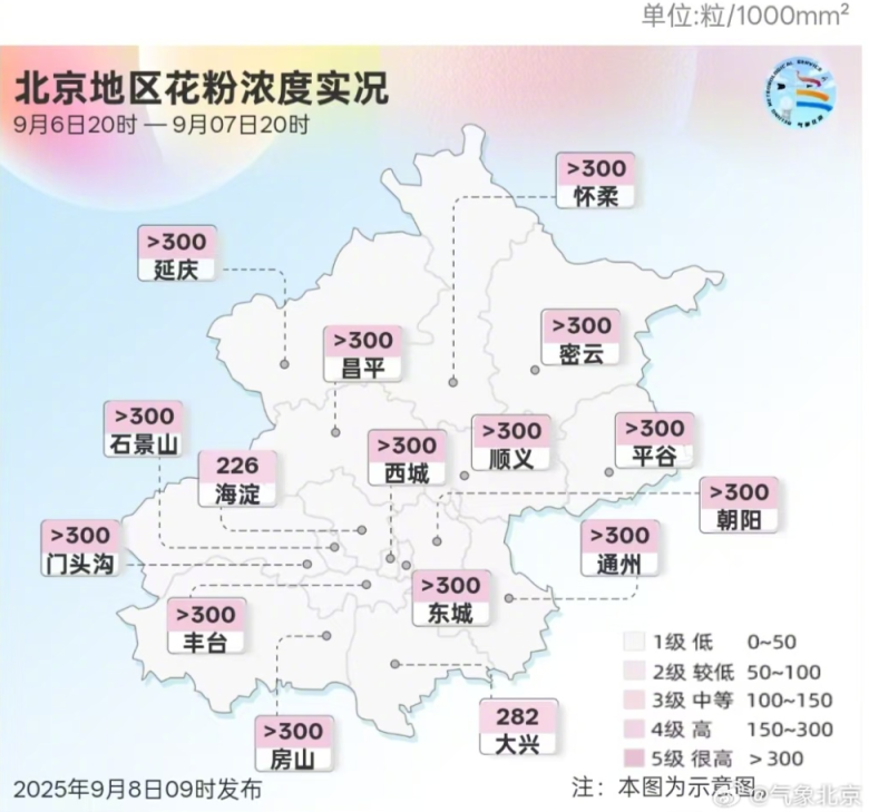 昨日北京花粉浓度品级为4到5级,大部分站点处于高至很高等别。