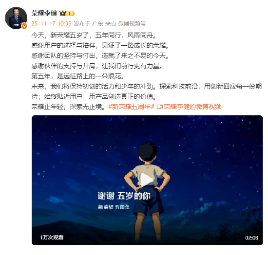 荣耀末端股份有限公司CEO李健11月17日日发文庆祝新荣耀5周年赌钱app下载,并对用户、团队、伙伴示意感谢: