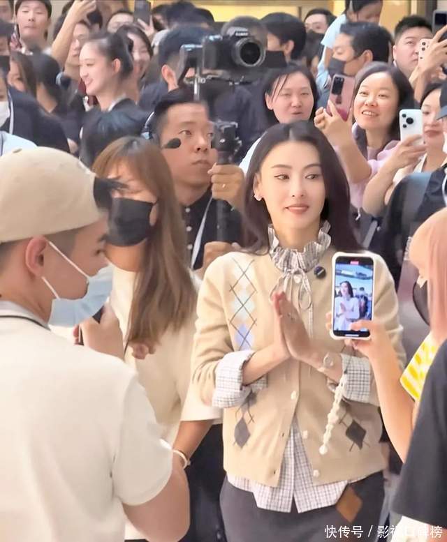 张柏芝温雅地与现场的粉丝打呼叫,双手合十示意了感谢。