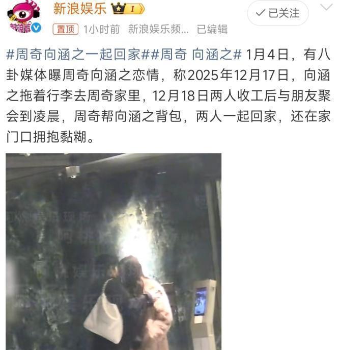 1月4日,著名娱记的一则爆料视频在网罗上掀翻了海浪。视频中裸露,12月17日和18日,向涵之和周奇一同进入盛典,适度后又与友东说念主聚餐,临了两东说念主搭车回家,在家门口还来了个拥抱。娱记描摹这个拥抱“黏糊了一阵”,不外看视频倒也并未有那么夸张。这本是明星间再平方不外的应酬活动,却因这一系列举动激发了浩荡见谅。