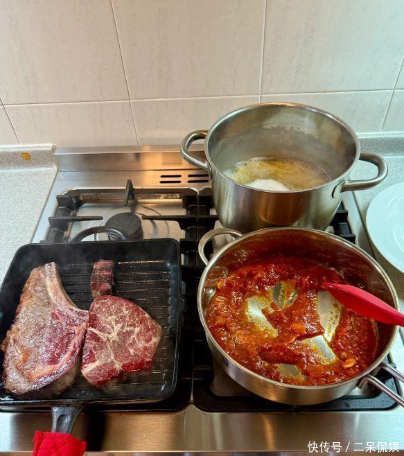 朱珠老公还共享了我方烹制好意思食的历程,四个灶开三锅,妥妥滴大厨手段。三锅皆下的王昀佳既要煎牛排,还要熬酱煮意面,一敌手简直够用吗?
