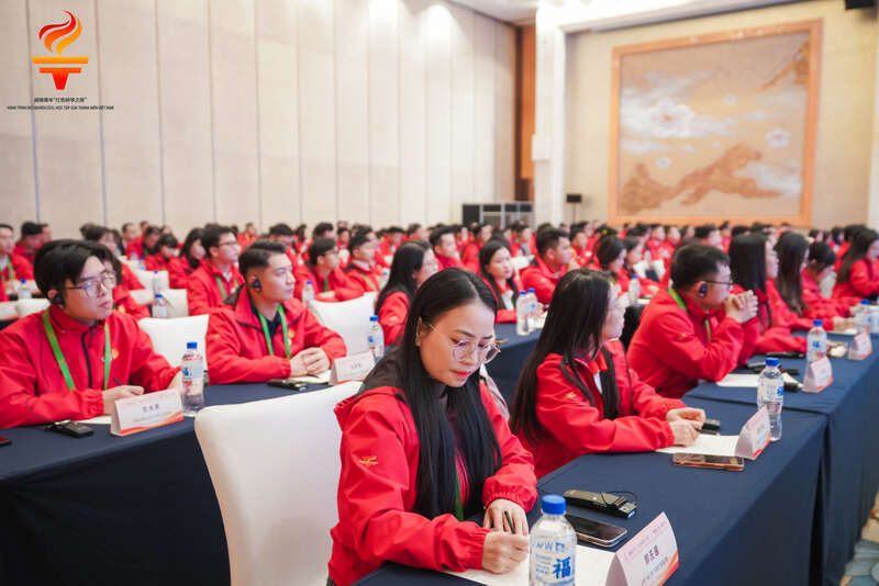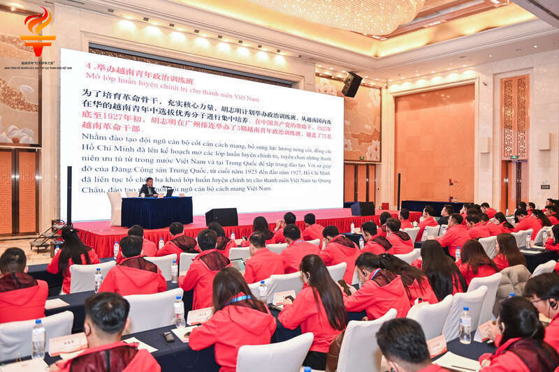 12月1日,云南昆明,投入越南后生来华“红色研学之旅”之“理念念之光”研学营的越南后生听取《胡志明在中国》专题讲座,中央团校老师、共青团中央青运史档案馆馆长胡献忠为研学团讲课。主理方供图