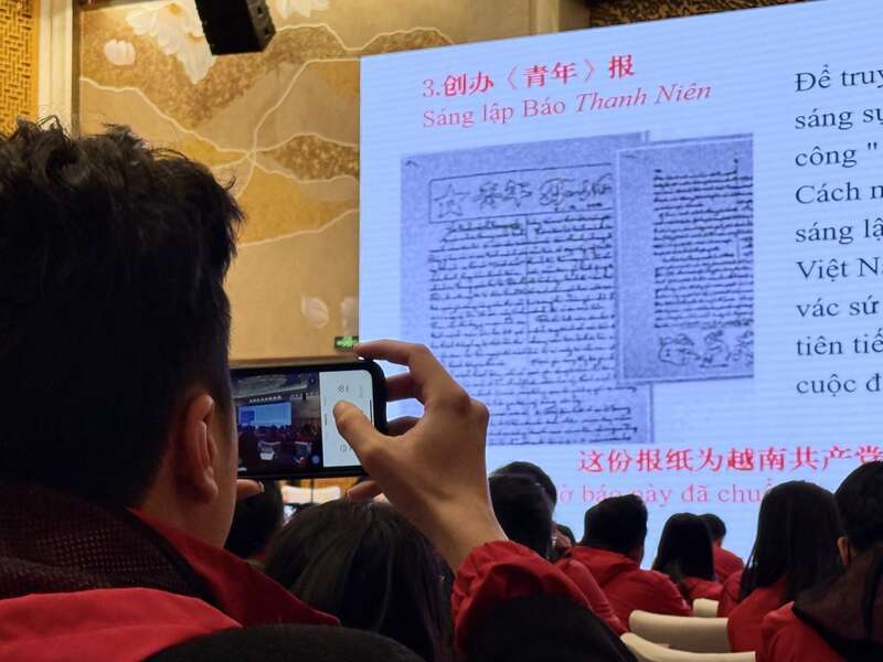 12月1日,云南昆明,越南后生听取《胡志明在中国》专题讲座。一位越南后生用手机拍摄幻灯片里对于越南共产党创办《后生》报的试验。中青报·中青网记者 马子倩/摄